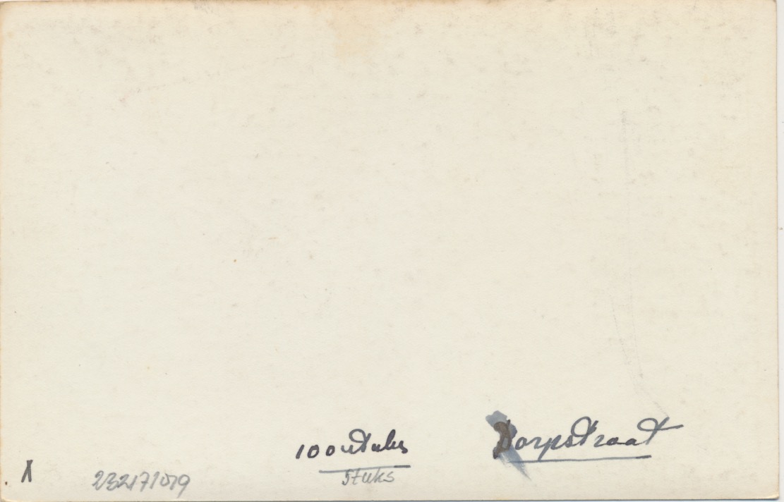 op de achterzijde staat Dorpstraat en het aantal te vervaardigen exemplaren, nl. 100 stuks