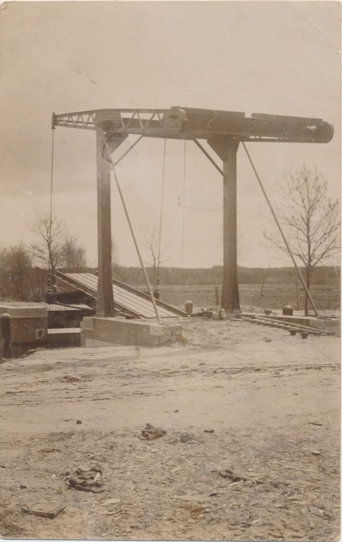 Volgens https://wijnjewoude.net/historische-fot ... anno-1923/ is de brugwachterswoning in 1913 gebouwd, dus pakweg 2 jaar na de opening van de tramweg, wat vreemd, maar niet onmogelijk. Op het zoekplaatje is de brug nog in aanbouw en zou de woning er nog niet zijn. De woning zou op de plaats van de fotograaf moeten komen. Brugwachtershuizen staan altijd aan de kant van de hameipoort. De brug vertoont op het zoekplaatje en genoemde foto dezelfde uítstekende stalen balk waaraan de klap aan kettingen is opgehangen. De foto is dan naar het zuiden genomen.