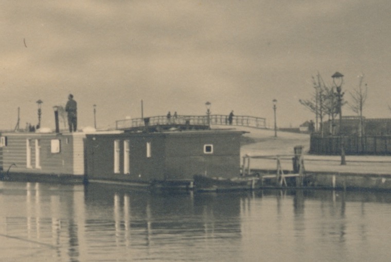 de rechteroever ligt vol met woonboten, erboven verheft zich een bruggetje met een stalen hekwerk dat evenwijdig loopt aan het water, op de voorgrond een overzetbootje, in de verte een achttal huizen