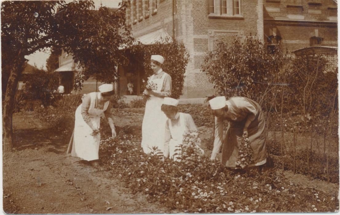 6215 4 verpleegsters in tuin bij instelling