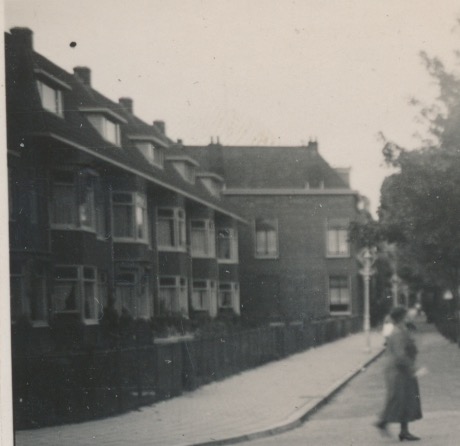 links huizenrij met erkers en tuintjes en aan het eind een haaks erop staand huis
