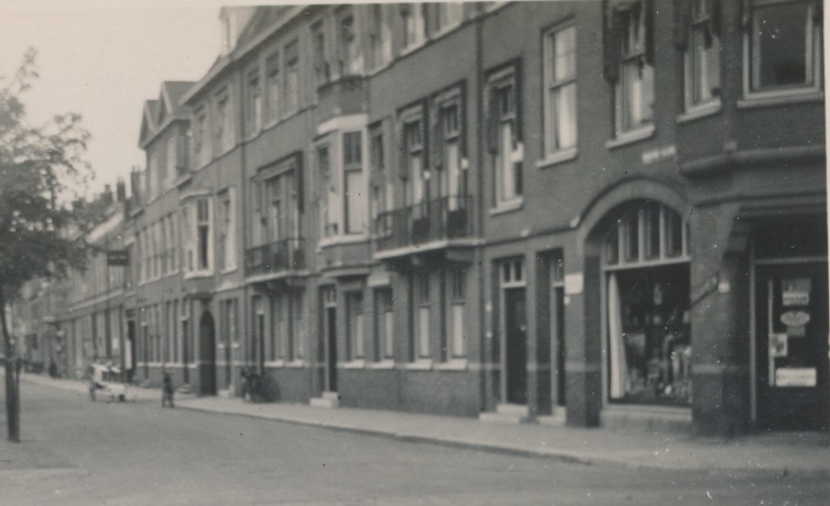 rechts op de hoek onder het straatnaambordje een winkel