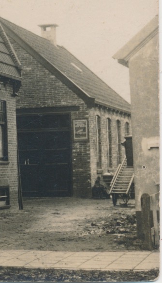 reclame op de schuur achter de winkel: droge en bereide verfwaren lakken kwasten