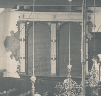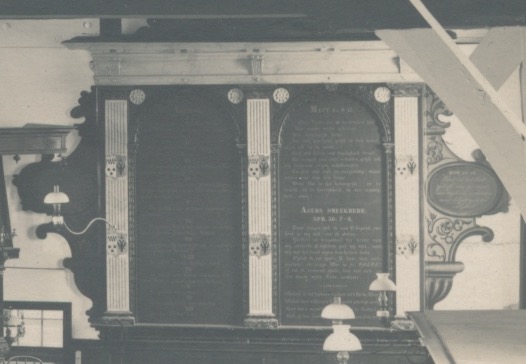 tussen de twee grote tekstborden de preekstoel