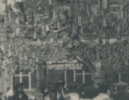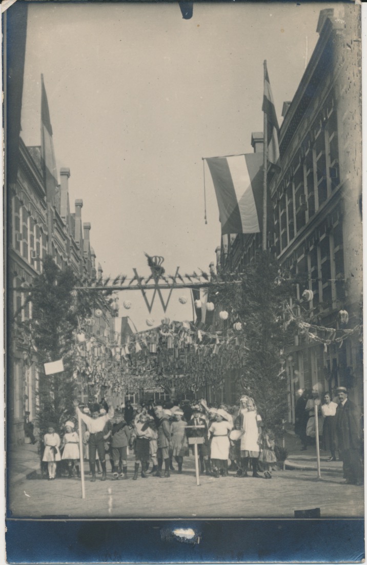 Spionnetjes zouden typerend voor Den Haag zijn, heb ik wel eens gehoord. Toch lukt het mij niet hiervoor een passende plek te vinden. Sommige panden hebben een topgevel met natuurstenen lijst, dat zie je wel op het Sweelinckplein en omgeving, maar de combinatie met een bedrijf verwacht je niet direct in een dergelijke buurt. Het kan het 25-jarig regeringsjubileum van Wilhelmina zijn (1923). Is een gedetailleerdere scan van de tekst mogelijk of uitlezen met een loep? Lijkt op telefoonnummers of huisnummers te eindigen.