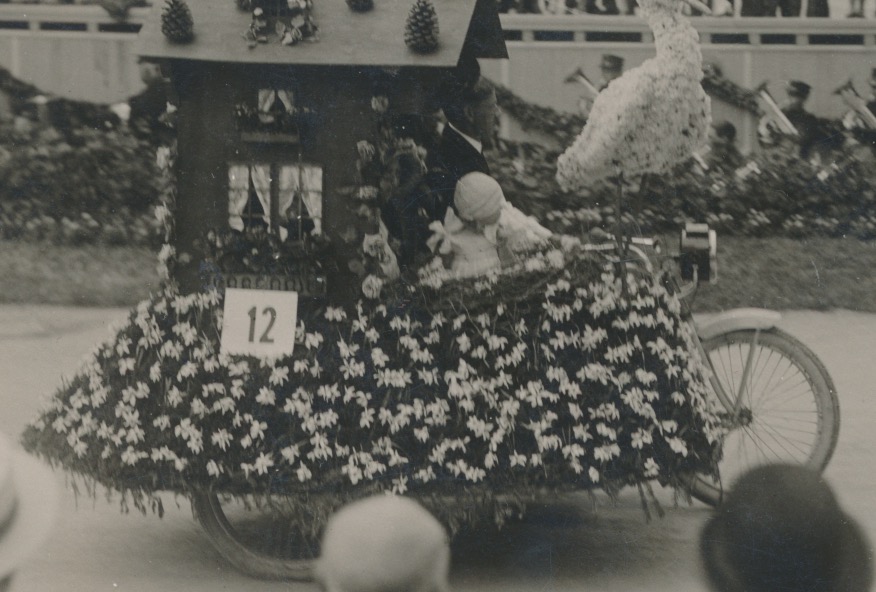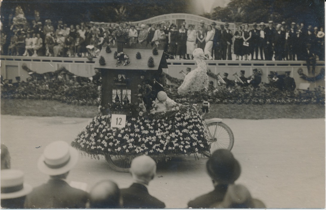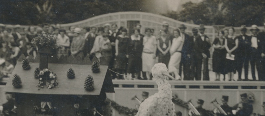 op de achtergrond is een tribune te zien, waarvoor zich muzikanten hebben opgesteld, mogelijk in een park