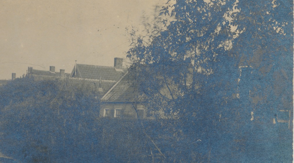 het lijkt of op het dak van het pand evenwijdig aan het water een deel pannen met witte strepen en een deel gewone pannen ligt