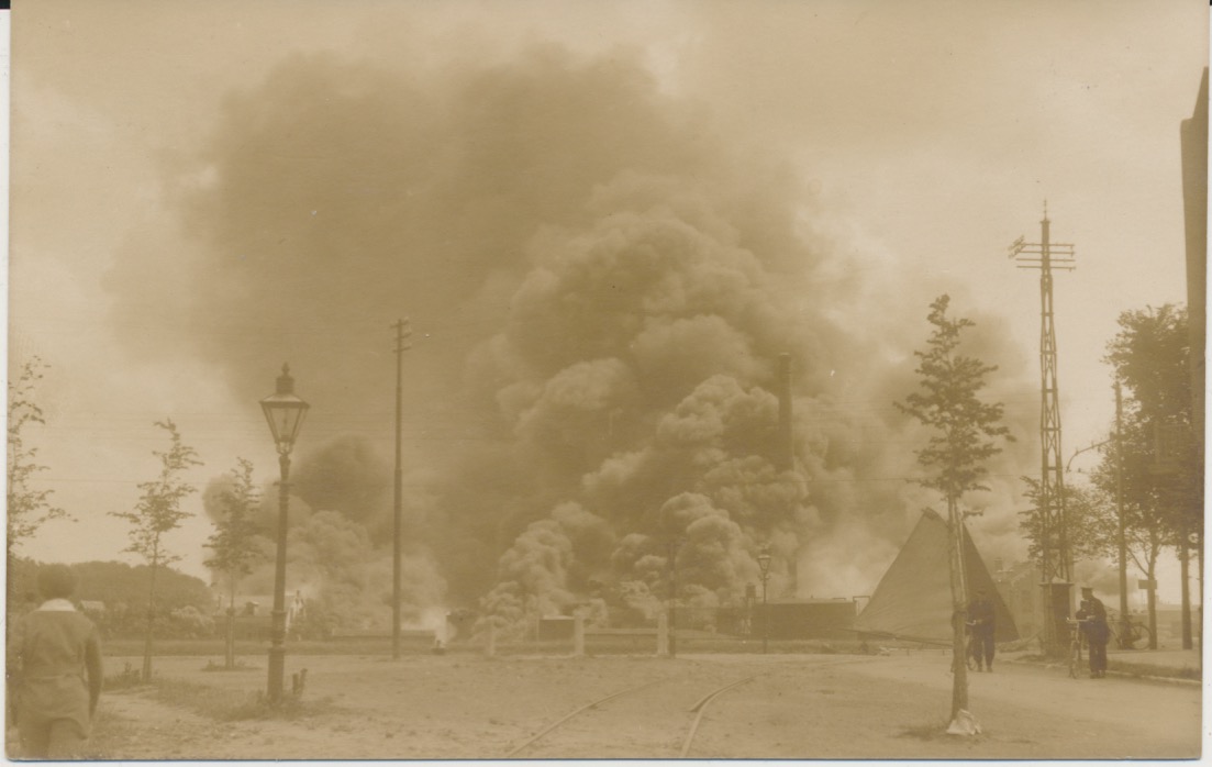 "Het betreft hier de brand van de NedPam (Ned. Petroleum -en Asphaltmij.) op 25 juli 1924 in Vlissingen. Op de voorgrond het verbindingsspoor van Kon.Mij. de Schelde. Van deze brand zijn een 40 tal fotokaarten uitgegeven."