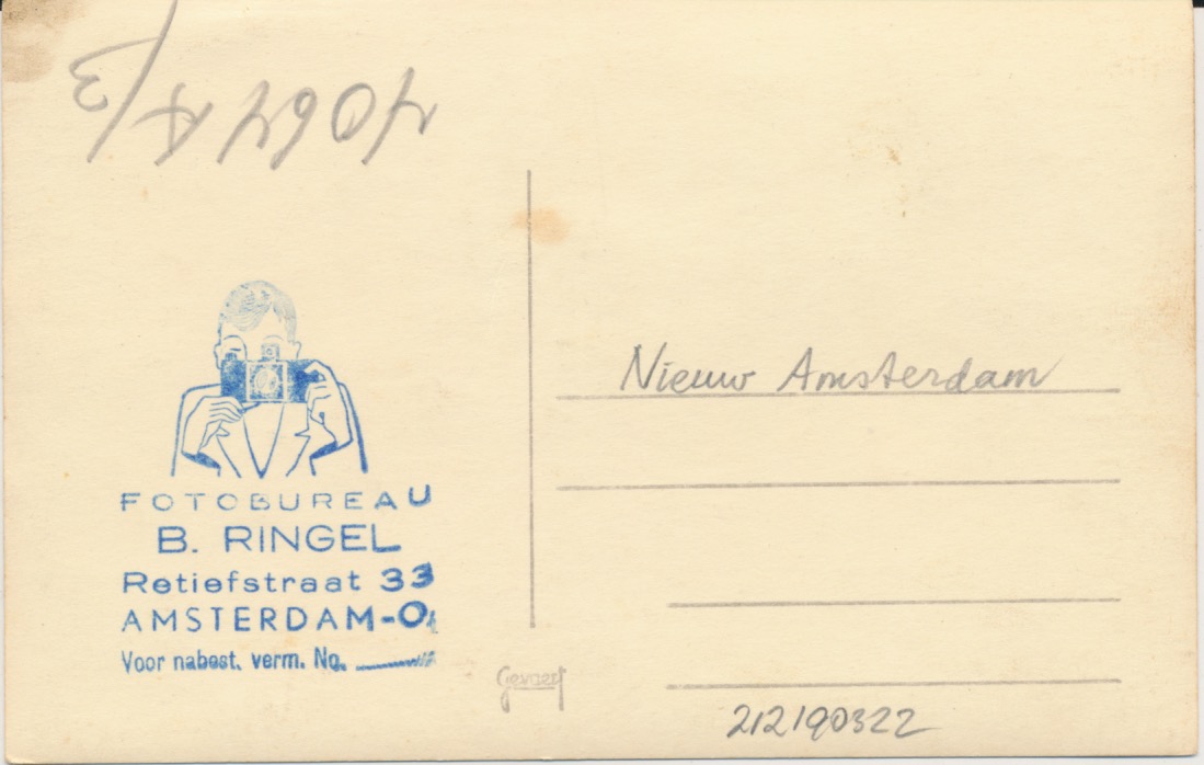 belijnde, ongelopen fotokaart, achterop stempeltje van Fotobureau B. Ringel uit Amsterdam, op Gevaert-fotokaartpapier