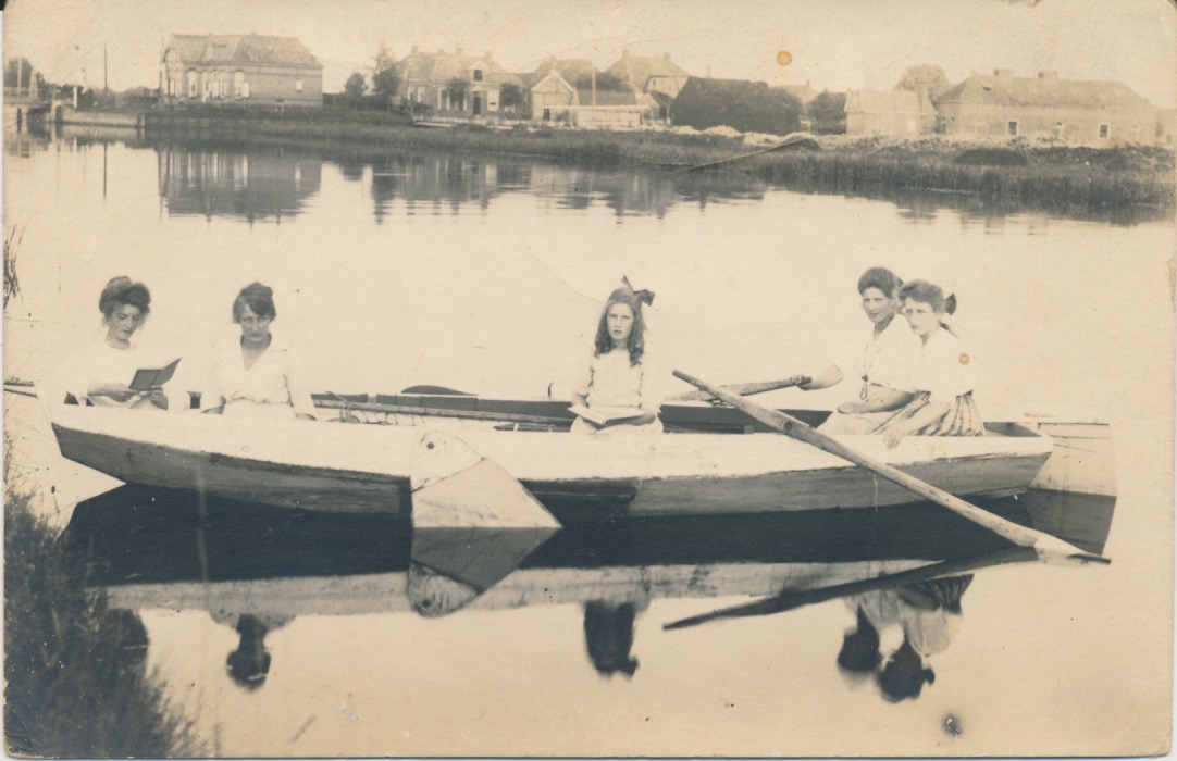 foto genomen van meisjes in een boot met panden op de tegenoverliggende oever