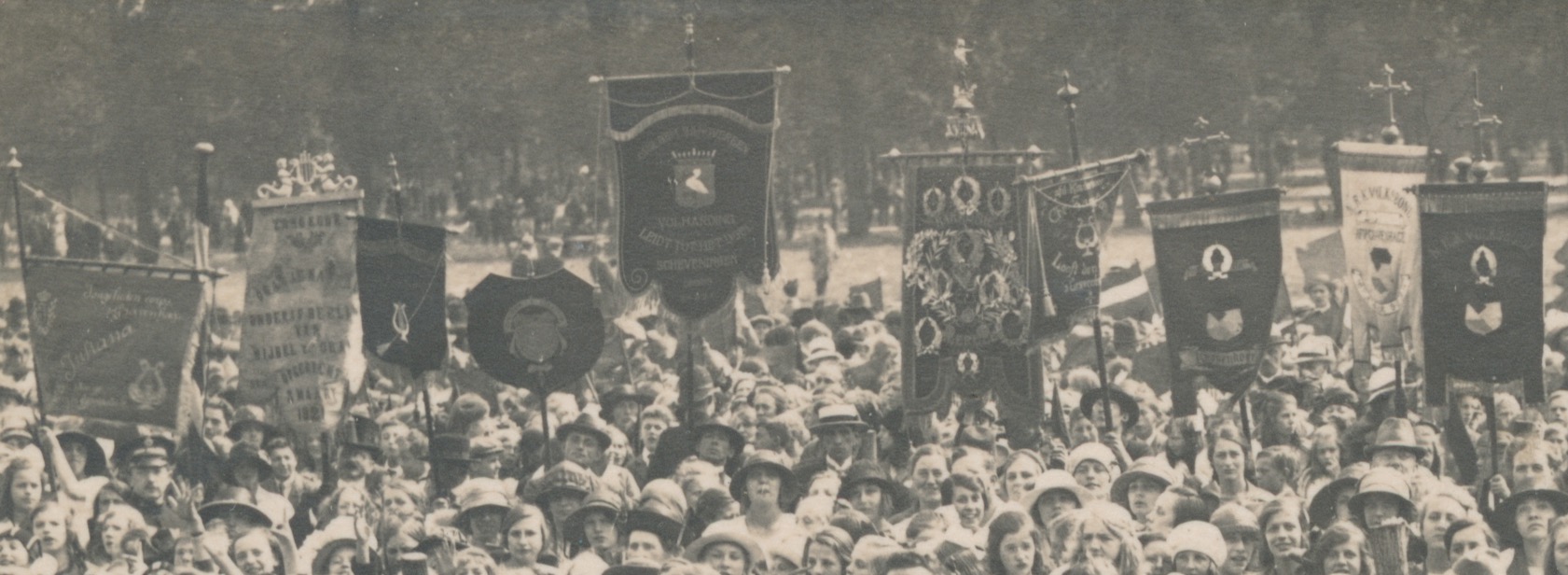 In dit artikel https://www.delpher.nl/nl/kranten/view?query=%22Volharding+leidt+tot+het+doel%22+volksbond+looft&coll=ddd&sortfield=date&identifier=MMKB23:001857102:mpeg21:a00007&resultsidentifier=MMKB23:001857102:mpeg21:a00007&rowid=4 (De Standaard 1-5-1924) worden de volgende 6 zangroepen genoemd die ik op het zoekplaatje zie: Jongelieden Zangkoor Halleluja, Volharding Leidt tot het Doel, R.K. Volksbond, Looft den Heer, Jongelieden Corps Juliana, Bijbel en Oranje. Het kan haast niet anders of dit is die zanghulde in 1924 bij Huis ten Bosch. Vanaf het bordes zag je deze rij bomen https://haagsgemeentearchief.nl/mediabank/beeldcollectie/detail/b60ce055-1301-4dc0-8dcb-c43aec3c01f8/media/6f8dfe61-8212-4aae-975b-f51589afbe6a en daarachter natuurlijk het Haagse Bos.