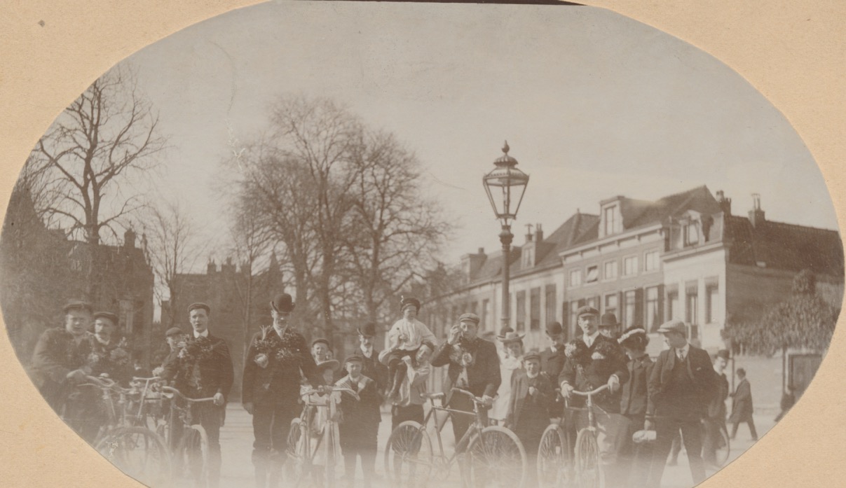 7498g dorpsgezicht met diverse fietsers met bloemenkransen - EJD