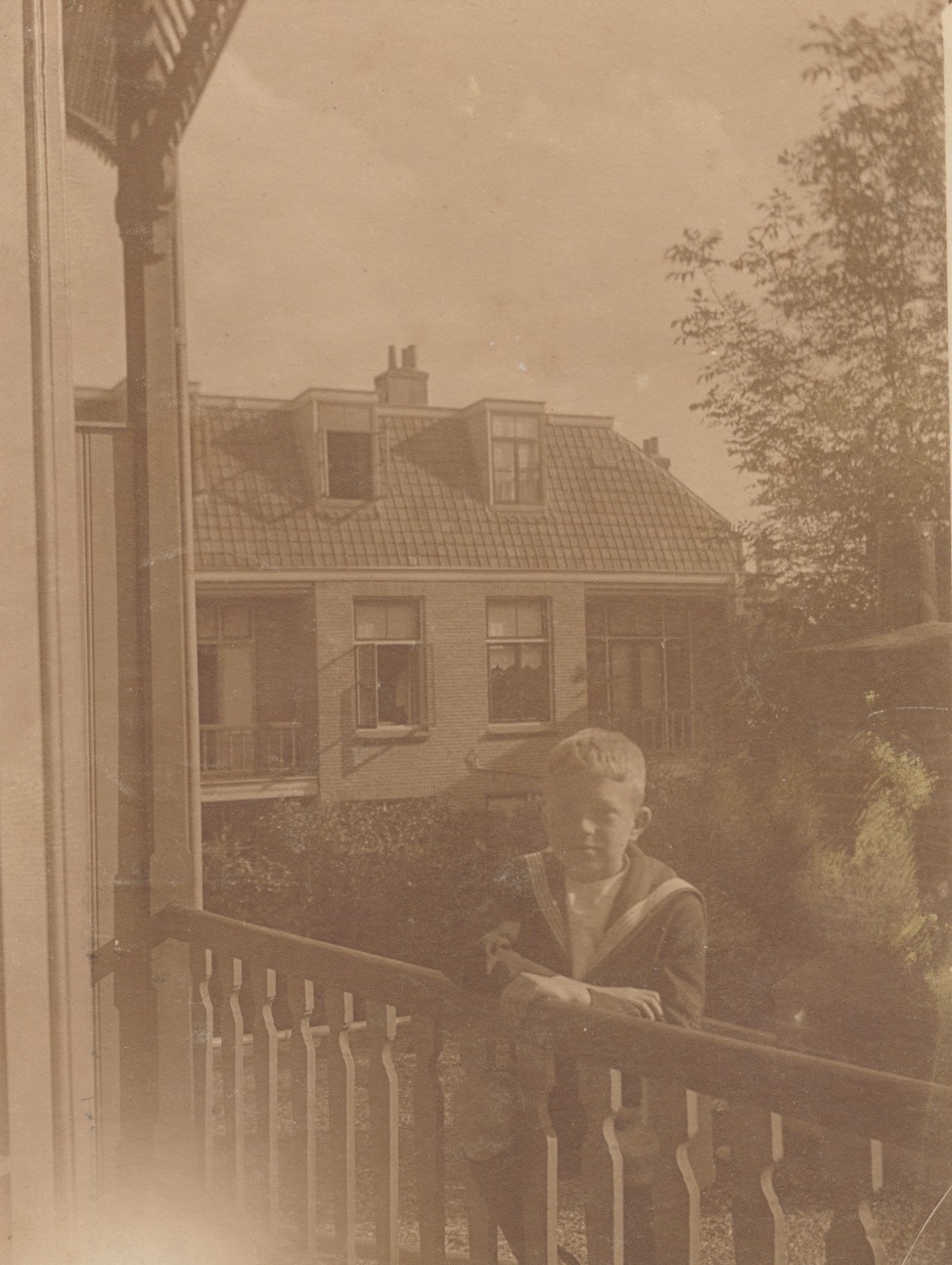 Moeilijk? Valt wel mee hoor. F.J. Walscheid woonde in 1923 aan de Hendrik de Keijserstraat 21 in Utrecht. Deze woningen hebben aan de achterzijde op de 1e etage een inpandig balkon (loggia). Bij sommige woningen is ook aan de achterzijde een bijkeuken aangebouwd, zo ook bij nummer 21. De jongen staat dus op het dak van de aanbouw, in de bijlage bij het kruisje. Op de achtergrond zien we de achterzijde van de woningen aan de Jan van Scorelstraat 59-65.