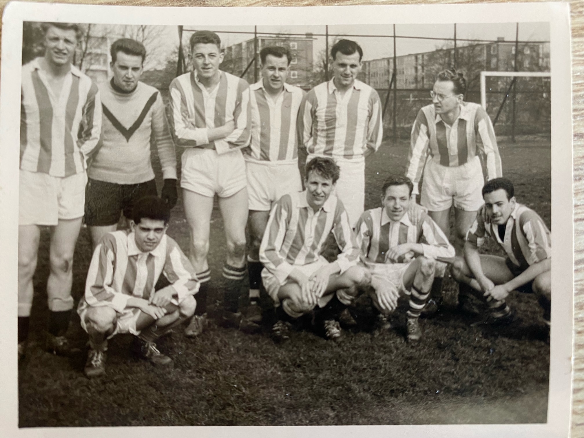 Elftalfoto, mogelijk Haarlem. De actiefoto lijkt hetzelfde elftal (shirts) in dezelfde omgeving.