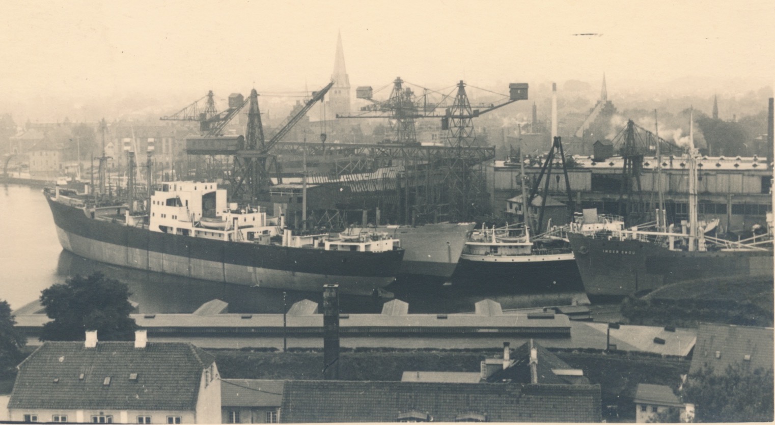 Ik vind maar één plaats in Noord-Duitsland of Scandinavië waar kranen stonden met een contragiek die onder een hoek van 30 graden omhoog liep, met daarop nog een huisje, en dat is Helsingør: https://helsingorleksikon.dk/index.php/ ... 621113.jpg. Aanwezigheid van trapgevels en de kerktoren kloppen ook: https://goo.gl/maps/4Ex3BXKW31Yf2adJ8. Tegenwoordig is het een cultuurscheepswerf.