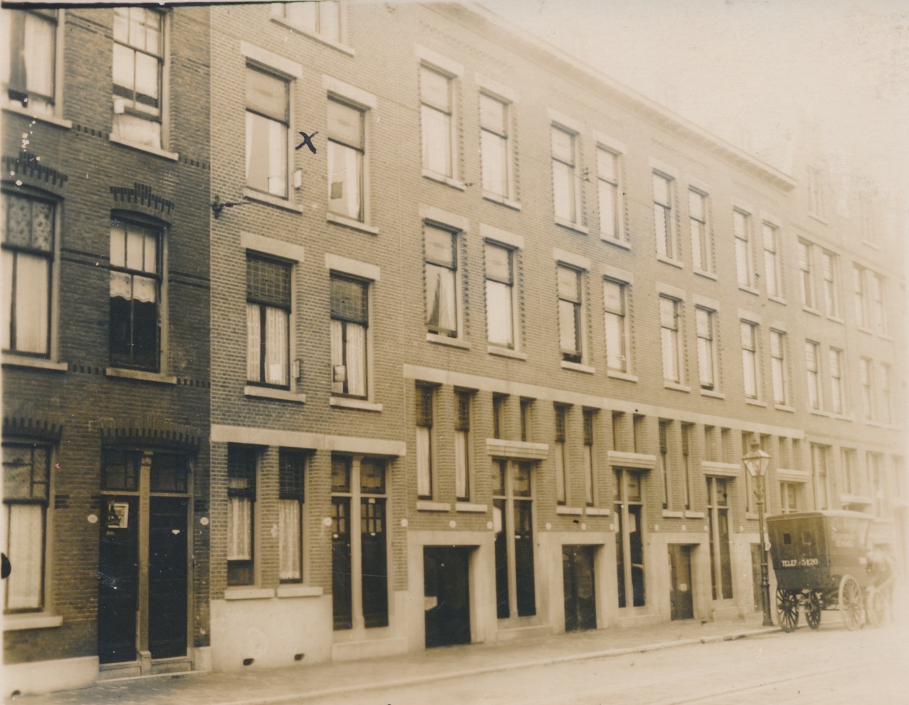 het lijkt een gewone middenklasse- of arbeidersbuurt, wat dan opvalt is dat er een tram door de straat rijdt, zie de draadhouder aan de gevel en de rails in het wegdek