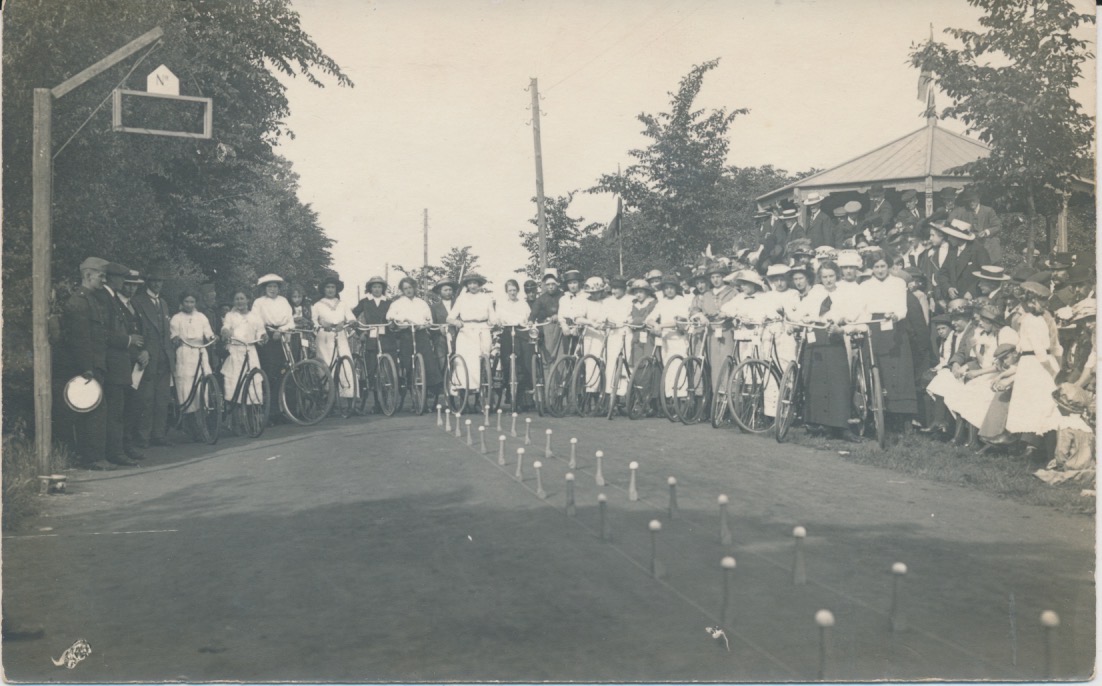 De eerste is op de website van Atria, Kennisinstituut voor Emancipatie en Vrouwengeschiedenis. Daar is niet de locatie van het zoekplaatje te vinden, maar wel een interessant artikel over wielrennen van het thema vrouwen in de sport. Wielerwedstrijden op de baan of op de weg waren destijds voor vrouwen verboden. Daarom werden voor vrouwen bloemencorso’s of behendigheidswedstrijden op de fiets georganiseerd. Op het zoekplaatje staat de start van een behendigheidswedstrijd. Rijden tussen de kegels door zonder ze om te gooien. De vrouw in klederdracht geeft aan dat we de afbeelding moeten zoeken in Noord-Holland, het hoofddeksel van de vrouw is een hul met boerenhoedje. De hul met boerenhoedje werd omstreeks 1900 door de gewone vrouw gedragen in Westfriesland en op Wieringen.