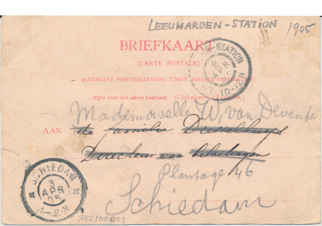 maar misschien is het een foto van thuis in Schiedam "Dag mijn lieveling, groet mama". Het blijft dan wel een raadsel dat het aankomstadres moet worden gewijzigd. Of het was een al eerder gebruikte kaart en is er een nieuw adres opgeschreven.
