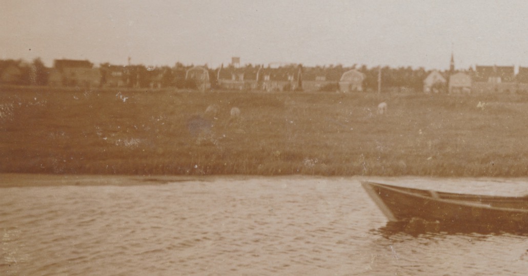 op de achtergrond links een afgeknotte molen en in het midden een kerktoren achter 2 witte huizen