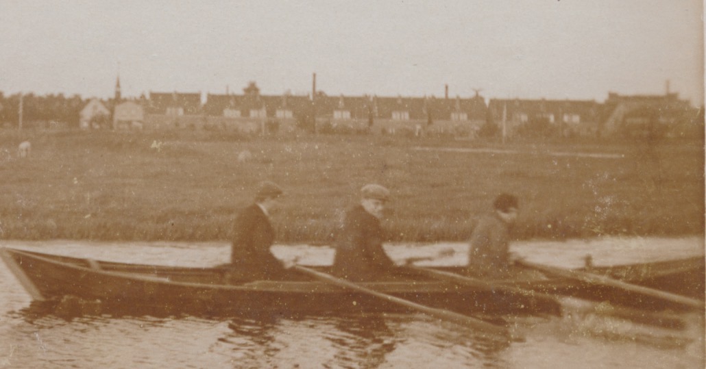 8251 roeiers met dorp op achtergrond