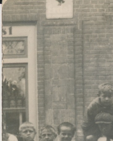 mogelijk links een drogist, erboven een emaille reclamebord van Erdal