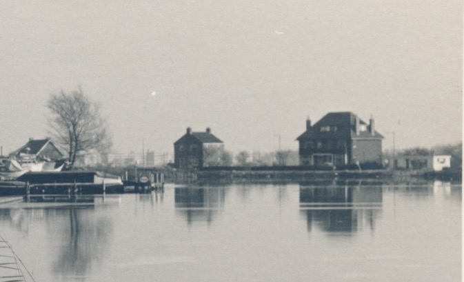 dan een landstrook of dijk met 2 forse woningen en een witte woonboot