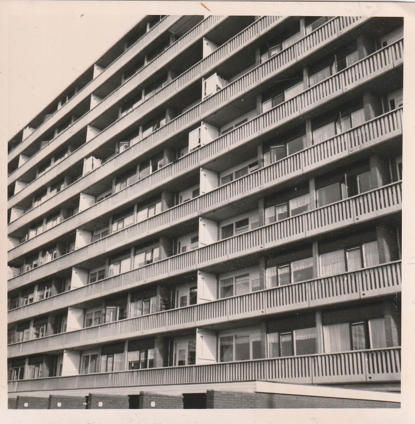 8 hoog flat, op de begaande grond staan uitbouwen met huisnr.bordjes ??