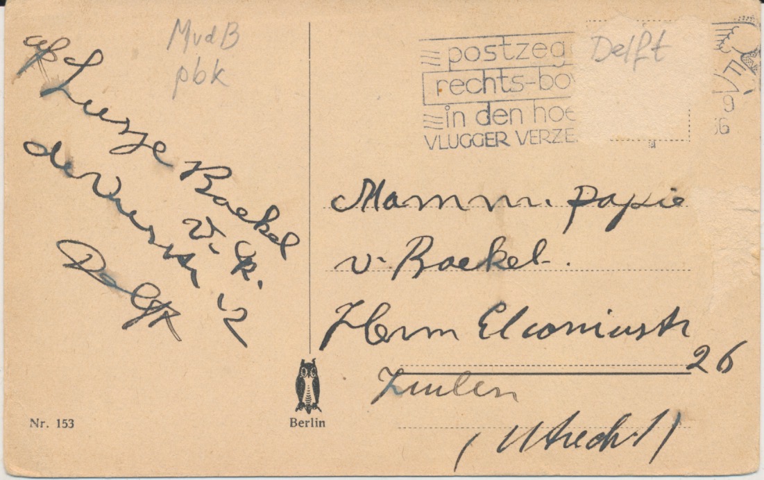 prentbriefkaart, uitgave Berlin, stempel Delft 1936 of 1956