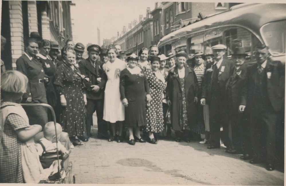 wsch. een busreisje i.v.m. een huwelijk, de bruid staat gearmd met de chauffeur