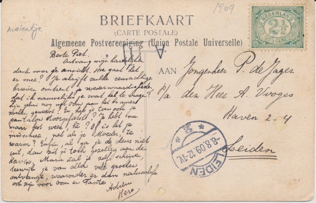belijnde gelopen fotokaart met aankomststempel Leiden