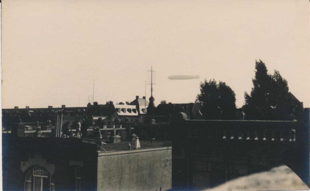 Ik vind de bebouwing op de voorgrond er Nederlands uitzien, bouw van begin 20e eeuw. Opvallend is de rechte daklijn links op de achtergrond met schoorstenen op onregelmatige afstand. Mogelijk is dit de vlucht van de Graf Zeppelin over Nederland op 13-10-1929. De route staat hier: https://resolver.kb.nl/resolve?urn=MMKB27:017912023:mpeg21:p00005.