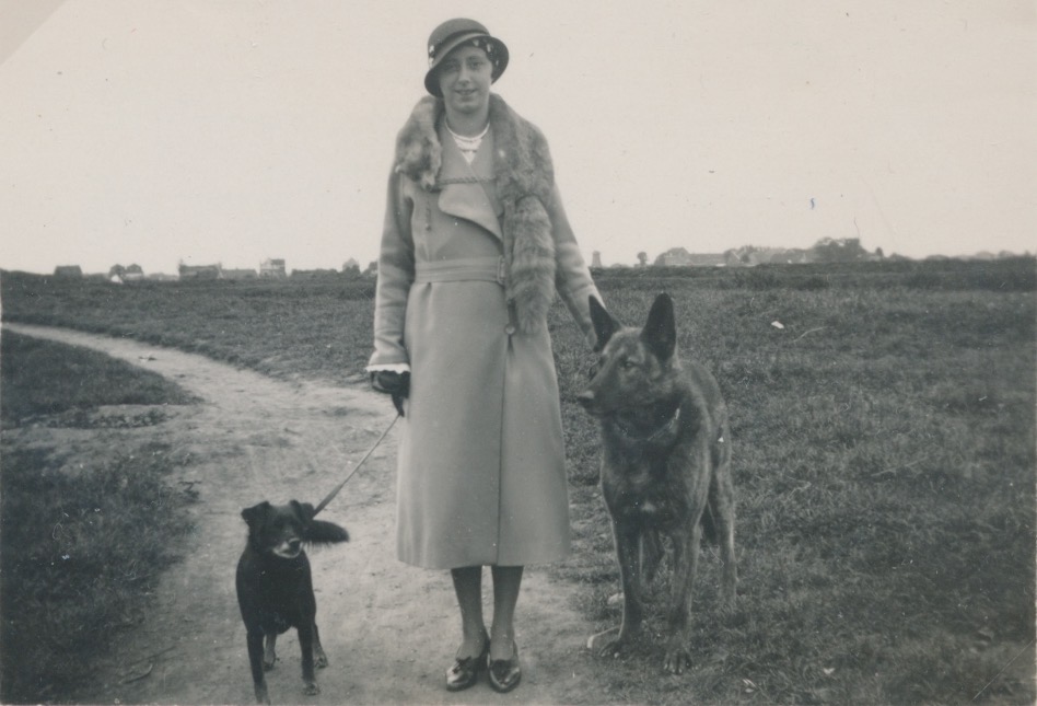 waar is deze hondenliefhebster aan de wandel, bebouwing op de achtergrond?