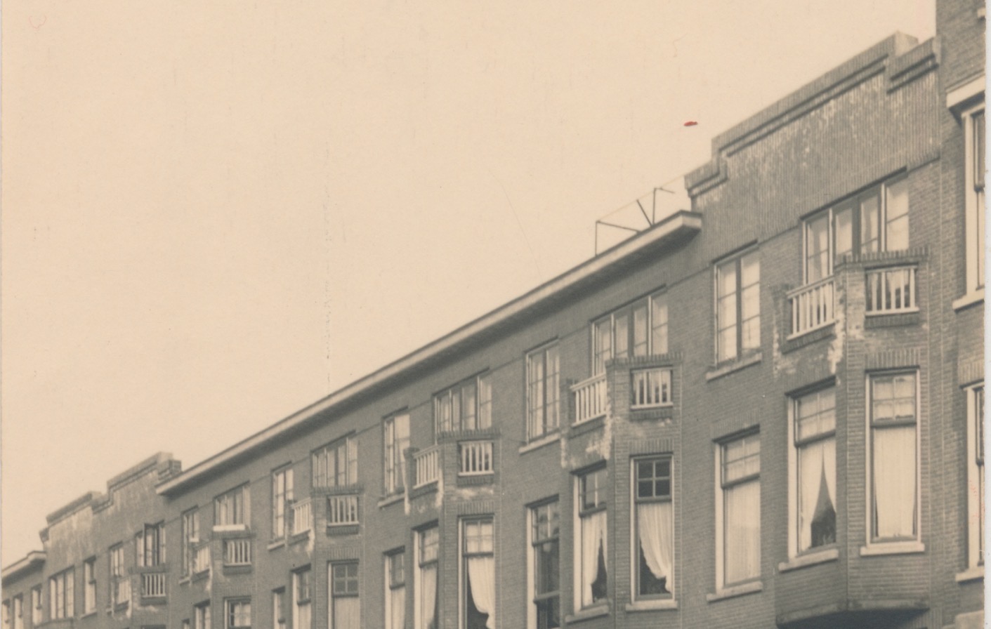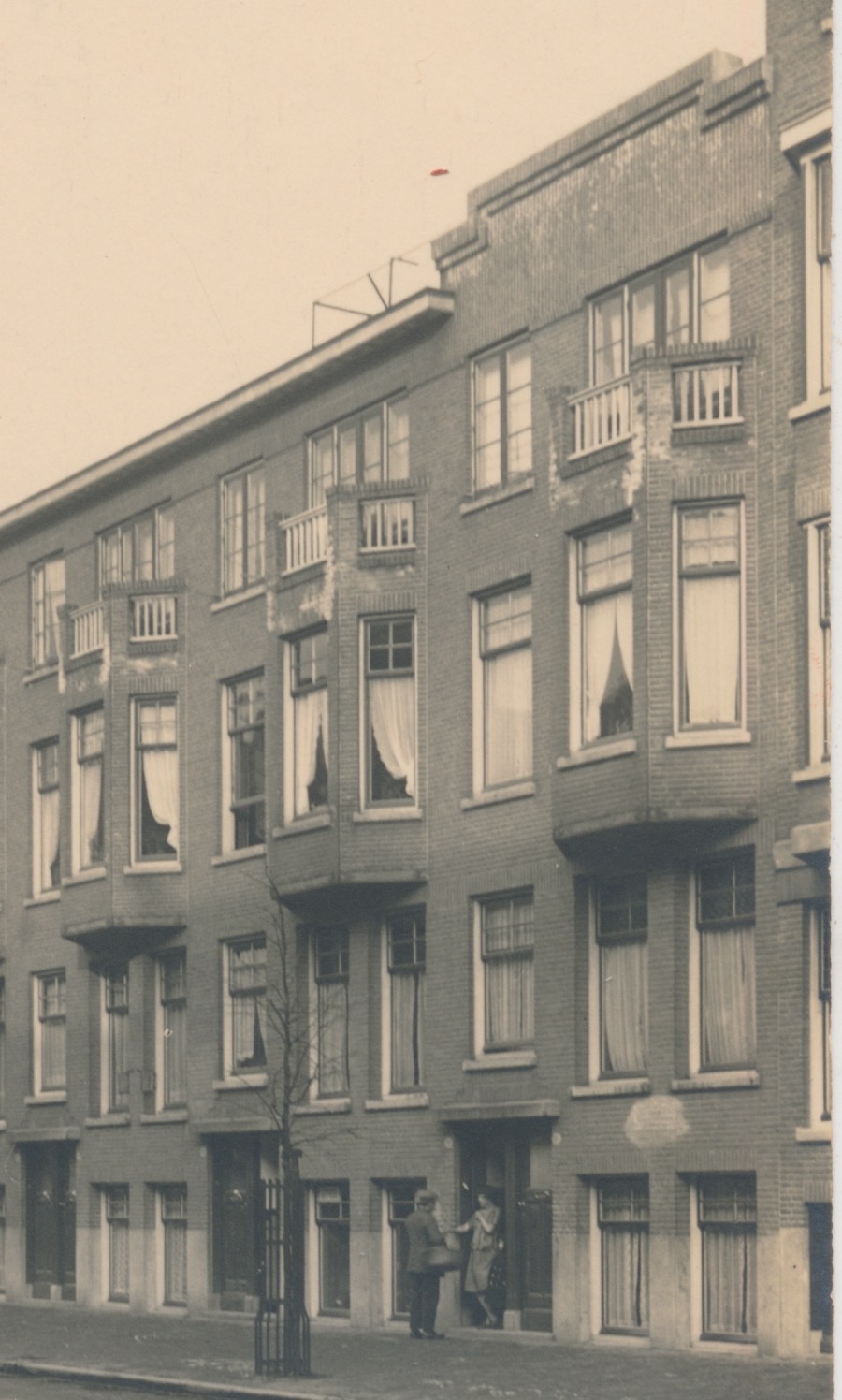 opvallende dakrand, souterrains, houten hekjes op de balkonnetjes, rechts een ander model pand gezien ook de dilatatievoeg