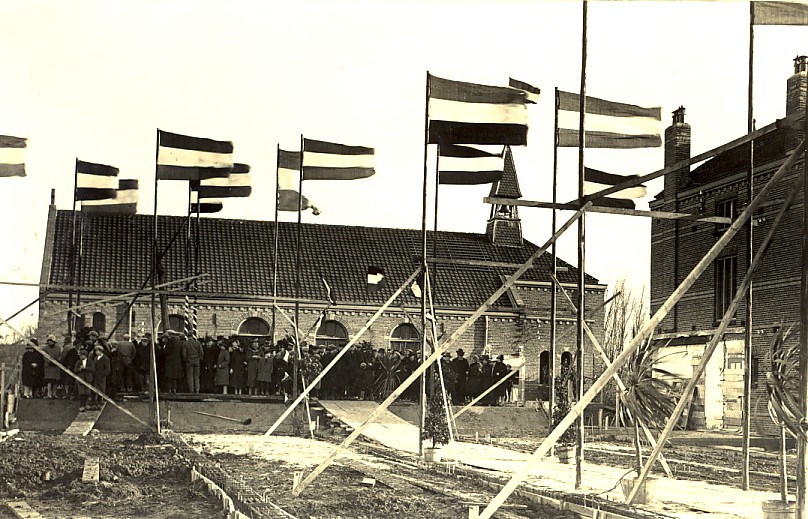als ik het een beetje goed inschat, is dit mogelijk de eerste steenlegging naast een kerkgebouw. De bouwplaats is versierd met kuipplanten. Twaalf vlaggen staan strak in de mast met erachter nog een vlag op de kerktoren, waarin een luidklok.