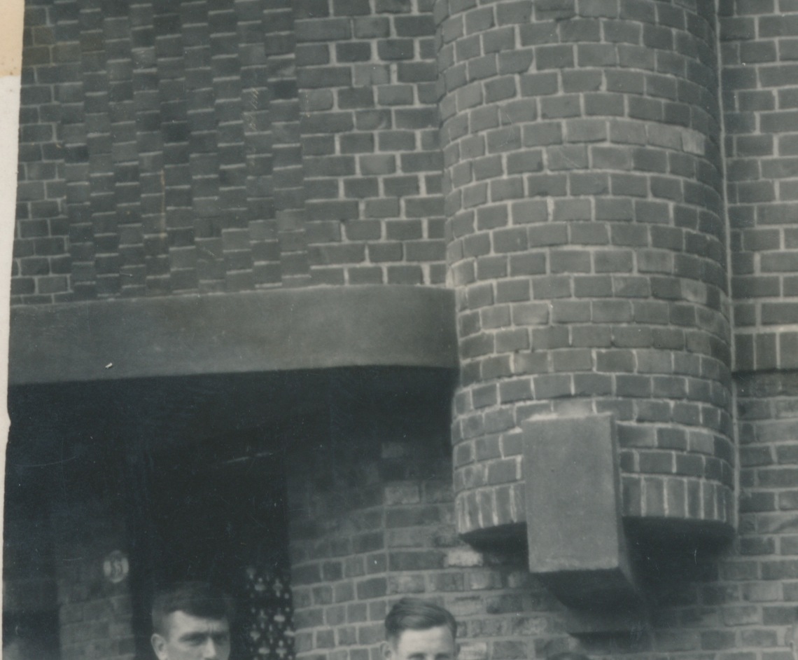 links boven de deur zijn 9 scherpe hoeken gemetseld met ernaast een halfronde gemetselde zuil op een uitstekende stenen voet