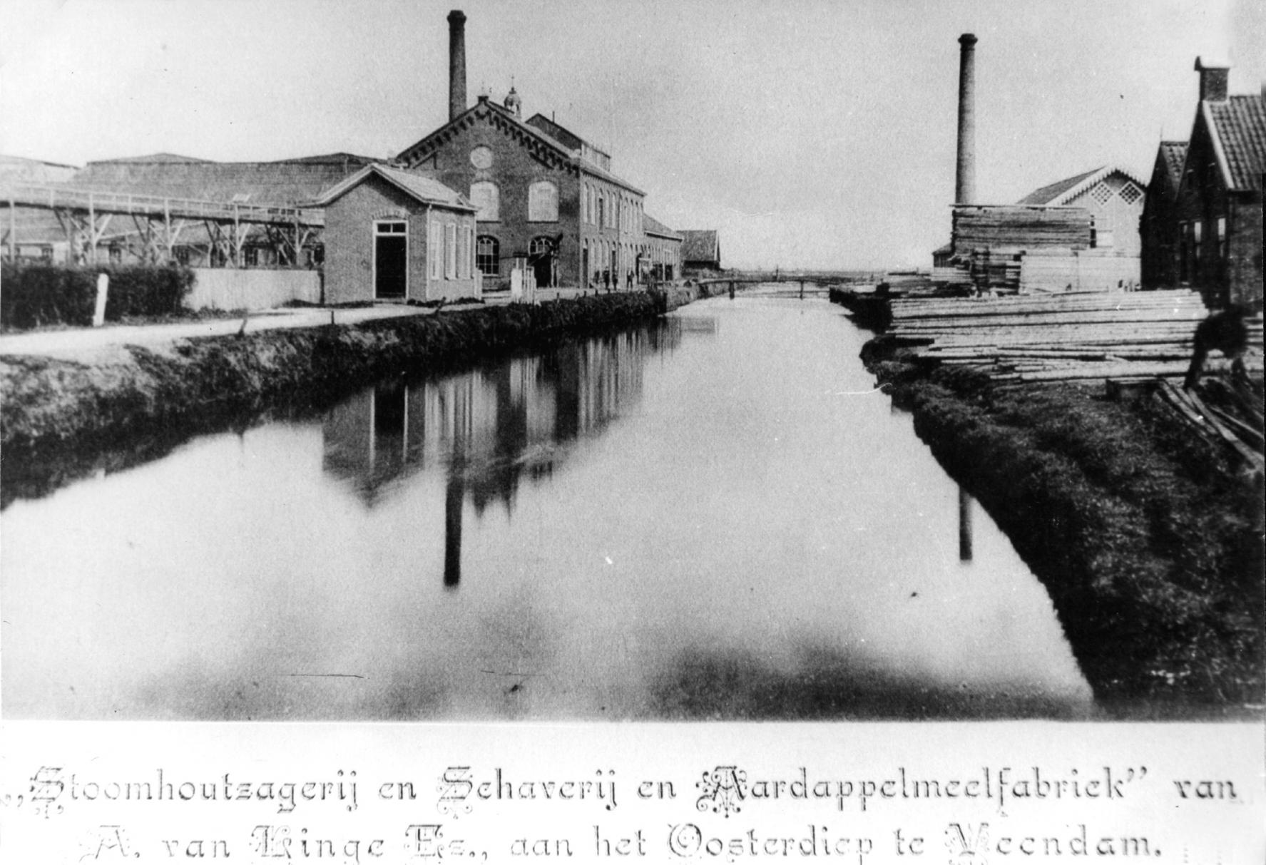 Zo te zien op het ZP, is er rechts een houtzagerij en links een aardappelmeelfabriek. Een nieuwe stoomketel ligt klaar voor installatie. Of is het de oude ketel?