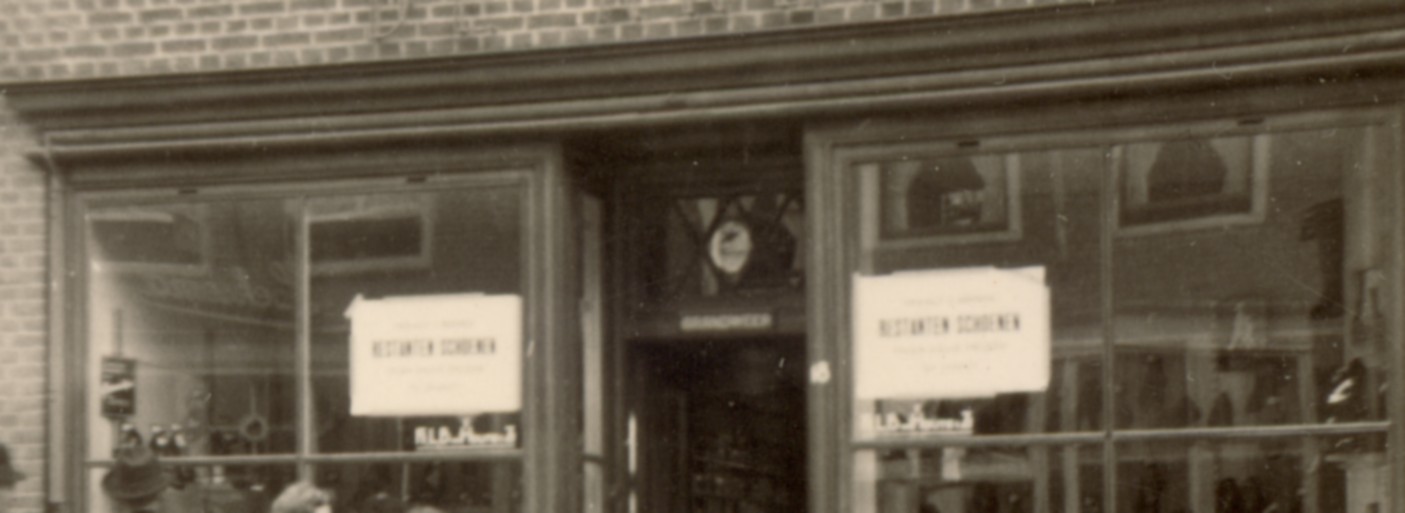 klein fotootje van schoenwinkel met op de 2 etalageruiten affiches met daarop restanten schoenen