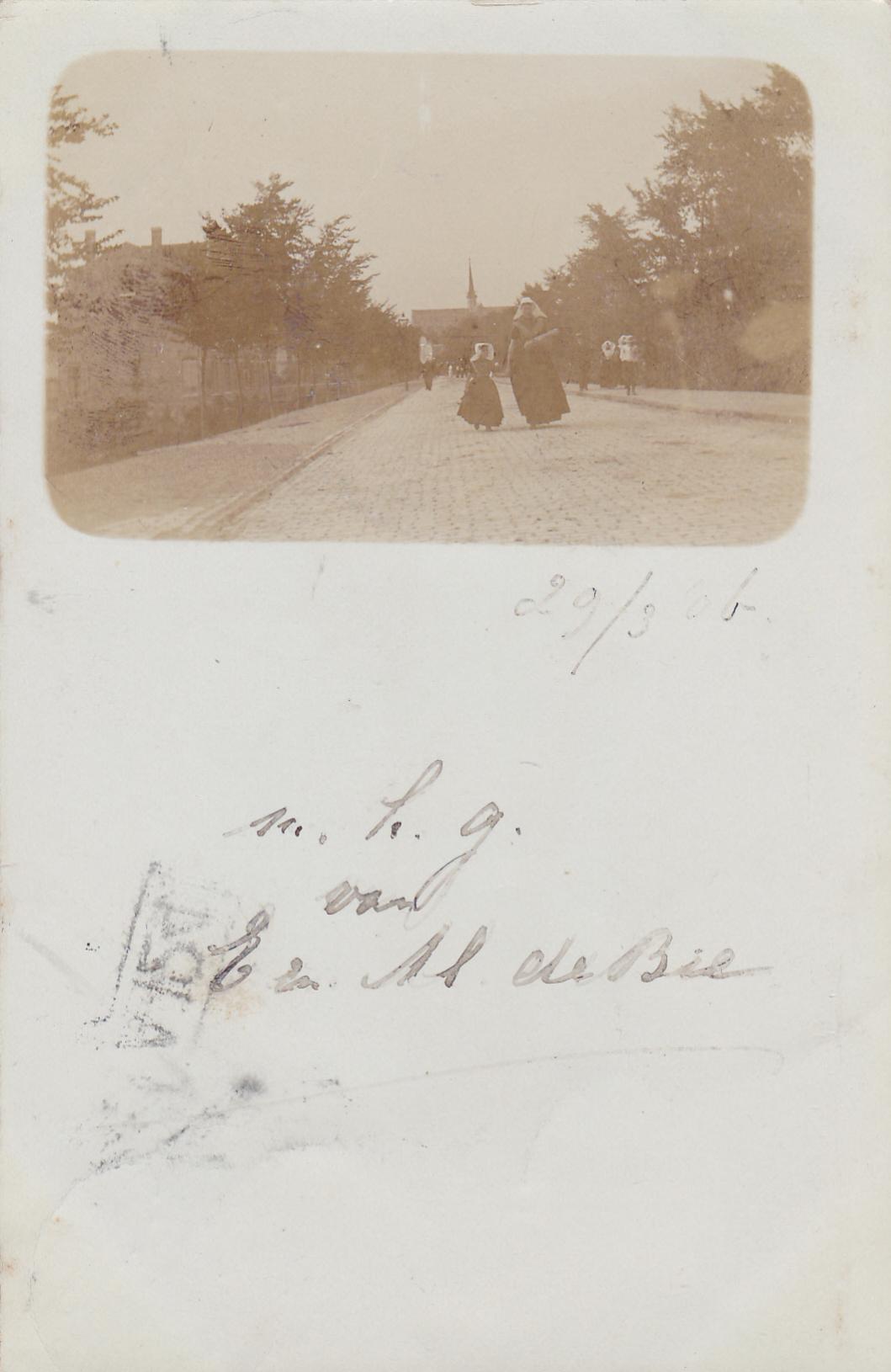 De kaart is verzonden naar G.H. Ledeboer Bzn, koopman Slotlaan 26. Hij had twee winkels in het centrum van Rotterdam. Het huis bestaat nog en staat aan de vijver in Park Honingen (Kralingen). De afzender is E. de Bie, particulier. Deze woonde Hoflaan 26. Dit is daar om de hoek. Beiden hetzelfde huisnummer. Misschien werden Hoflaan en Slotlaan weleens verward? De kaart is dus van Rotterdam naar Rotterdam verzonden. De foto kan overal zijn genomen, maar het ligt meer voor de hand in de omgeving van Rotterdam te zoeken en wel in het Overmase vanwege de klederdracht van de ZH eilanden (keuvel). Maar Zeeland is natuurlijk niet uitgesloten.