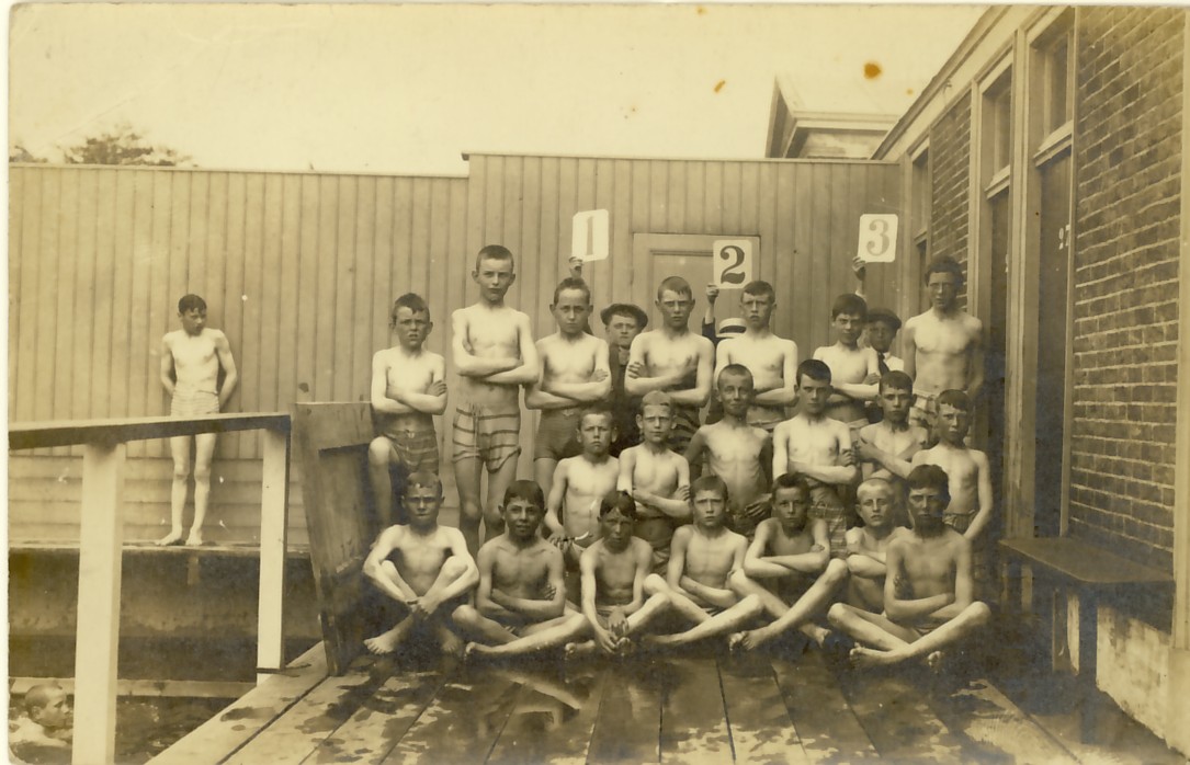 Een foto uit 1897 van zwembad De Houtvaart. Let op de kleedhokjes.