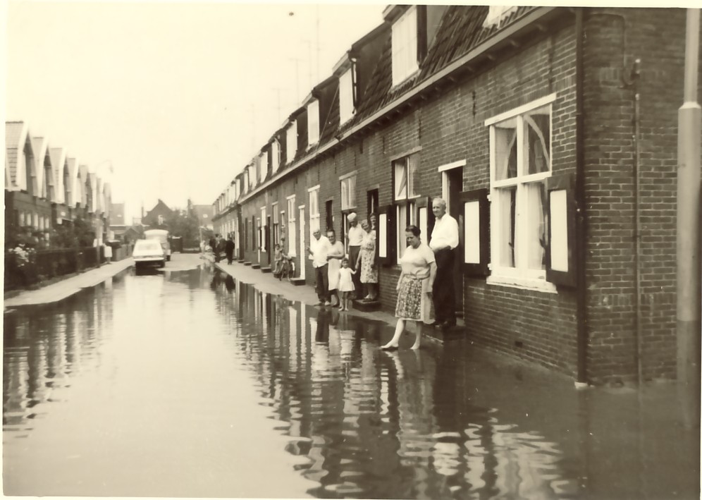 De overstroming in Tuindorp Oostzaan was op 14 januari 1960. Het was koud. De luchtige kleding van de mensen op de foto past daar niet bij.