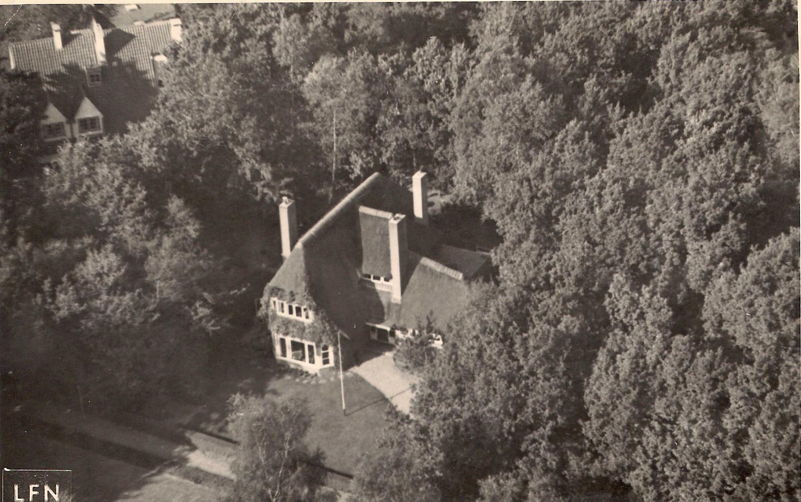 LFN, luchtfoto van villa in villawijk, rietenkap, poststempel Amsterdam 1952