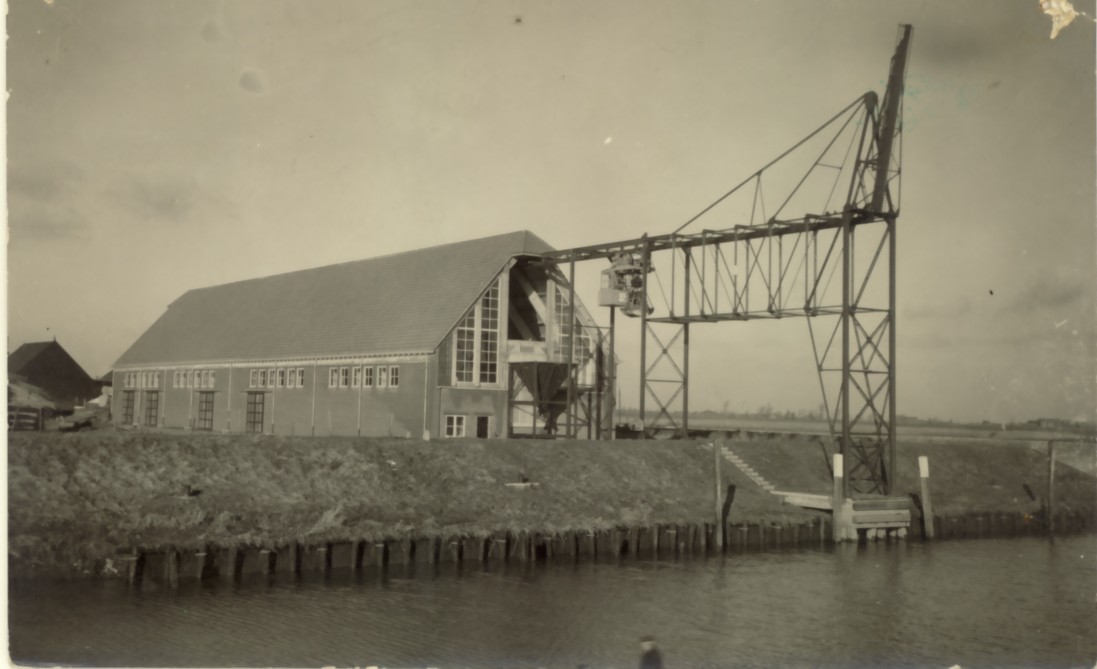 de lokatie is overtuigend bewezen. Martin en E. Fennis dank ik graag voor hun speurwerk.Ik heb de kaart zelf nu eens wat nauwkeuriger bekeken. Ik zie een cabine -waarin iemand kan plaatsnemen- die langs het horizontale deel van de stalen steiger kan worden voortbewogen. Daaronder een grijper, die in twee silo-achtige trechters kan lossen. De twee trechters staan niet op gelijke hoogte en naar ik inschat, kan er een vrachtwagen onderdoor rijden om aldus te worden geladen. Wat er wordt vervoerd en geladen blijft tot nu toe (nog) een raadsel. De cabine kan ook naar binnen de loods/opslag in. Op de cabine en de steiger een bordje, maar onleesbaar.