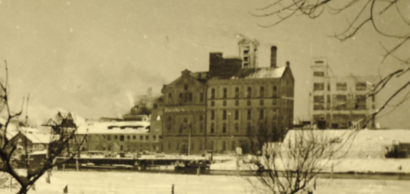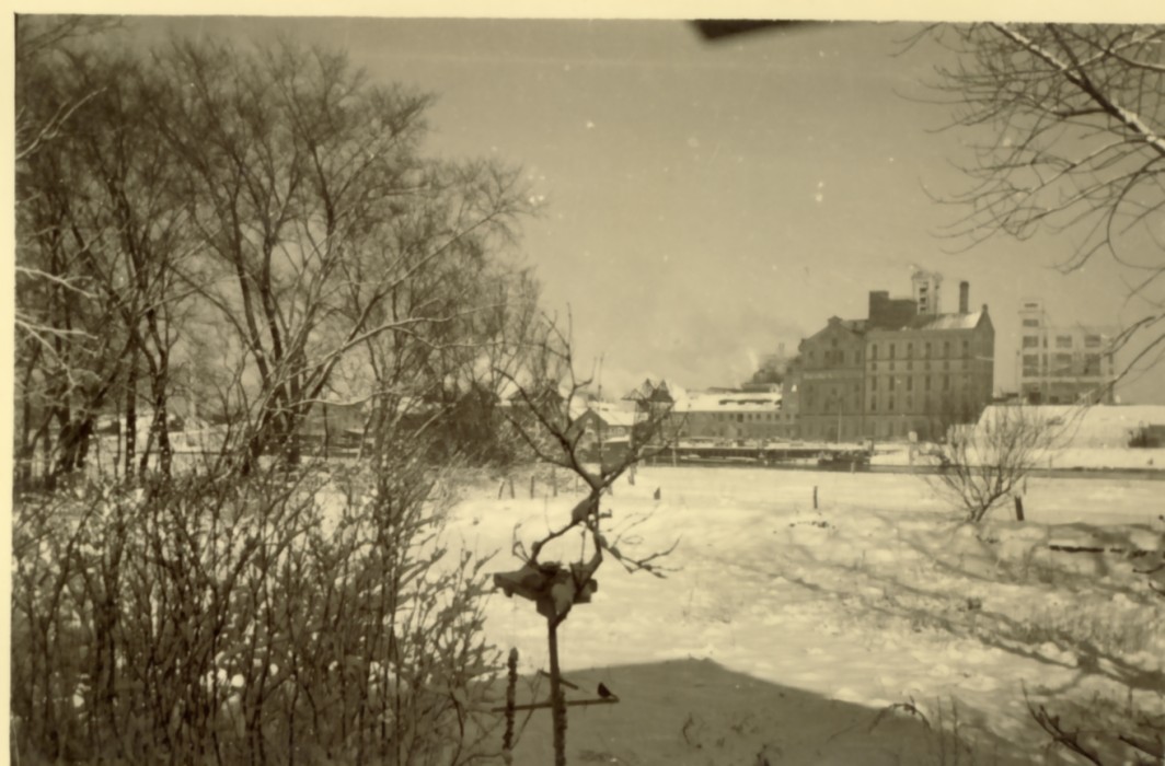 2613 bevroren rivier met fabrieken langs de oever