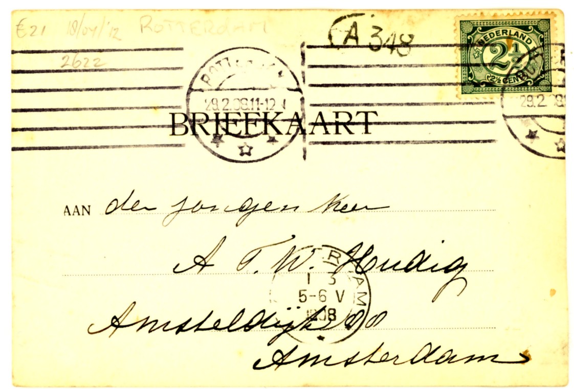 de kaart is verzonden op 29-02-1908 (schrikkeljaar!) en afgestempeld met afzendstempel Rotterdam