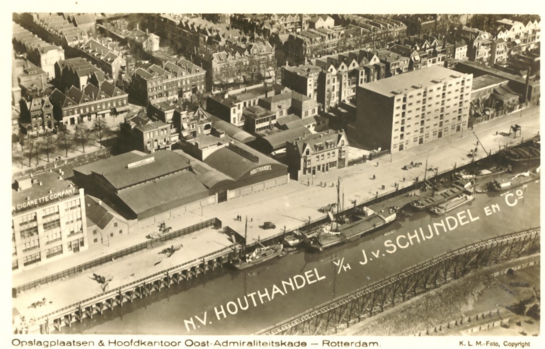 ik ben natuurlijk niet voor één gat te vangen en zat me te bedenken, hoe ik het pand in beeld kon krijgen. Met de luchtfotoboeken van Rotterdam lukte het niet. Maar misschien vanaf de Admiraliteitskade? Ja, en dat is gelukt. Met een prenbriefkaart uit eigen verzameling. Kijk maar naar de detailscan.