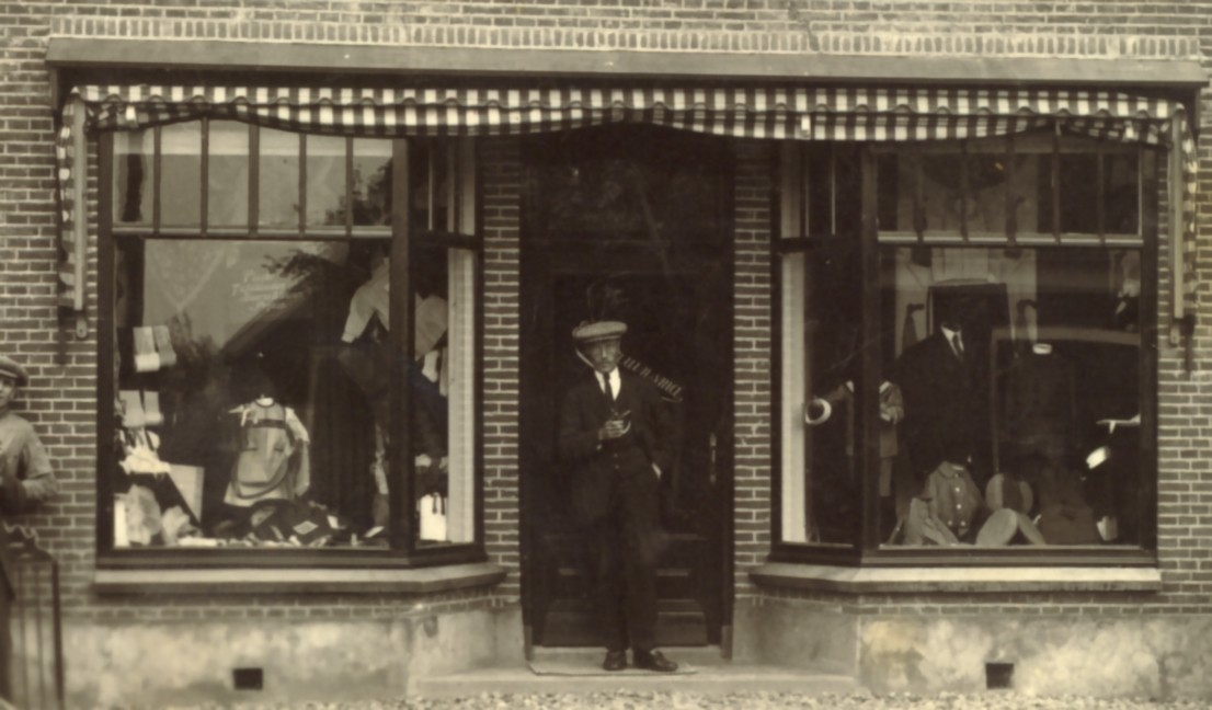 achter de rechter etalageruit staat jongens- en herenkleding opgesteld
