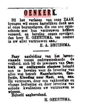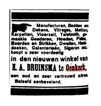 In Oenkerk was gevestigd manufacturenhandel E.A. Bruinsma.