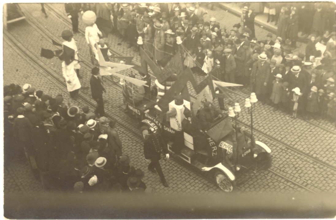 op de auto staan namen: Franklin, Jan v.d. Heyden, Edison, Hughes, Röntgen, Schäff, Herz, Ampère, Eisler, Ehre.. en nog meer