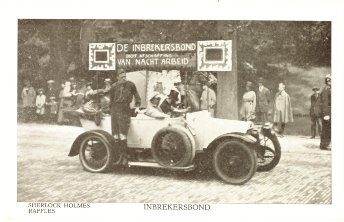 ook vond ik nog de derde kaart waarvan ik zag dat hij ook in de serie past en die me erg aanspreekt met thema Inbrekersbond Sherlock Holmes, Raffles en op het bord: de inbrekersbond eischt afschaffing van nacht arbeid