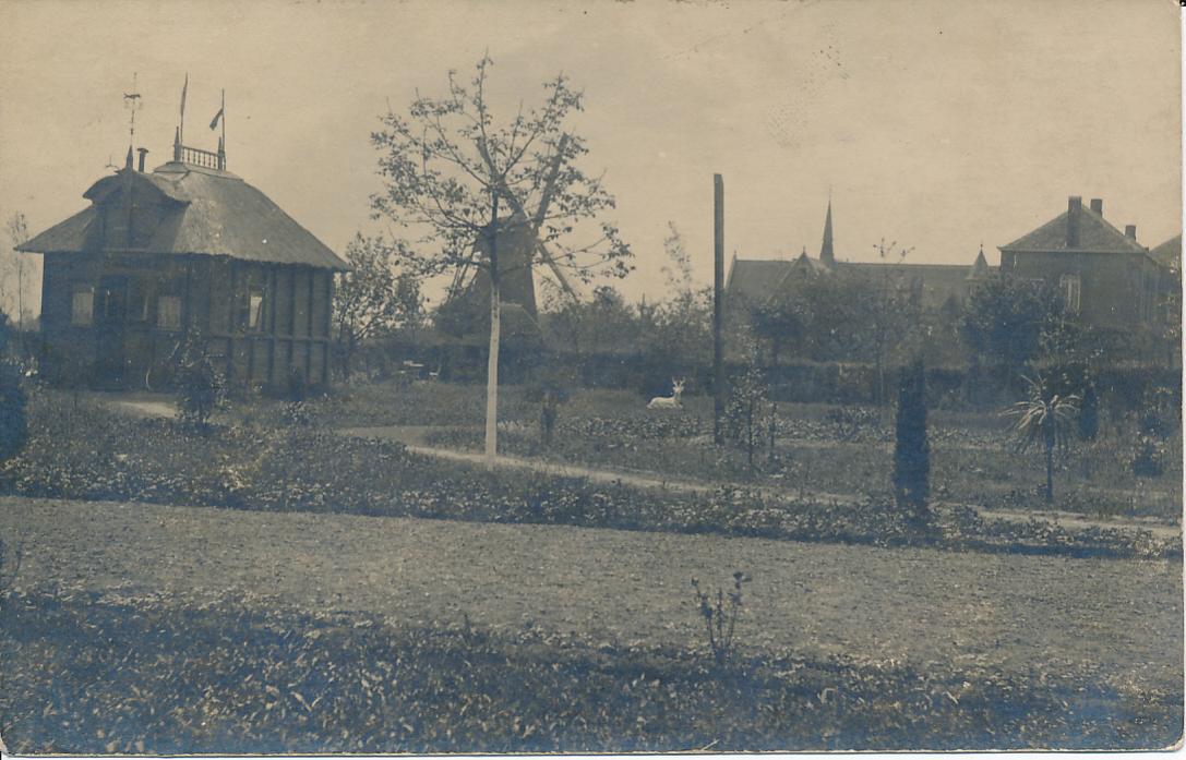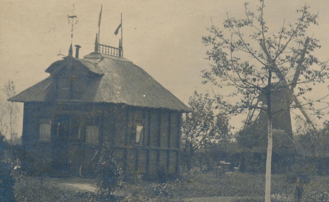 2924g rietgedekt houten gebouwtje met molen op achtergrond, maar welke molen? JM